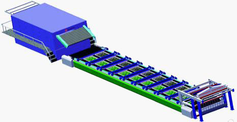 平网的工作原理:印花织物由进布装置粘贴在沿经向循环运行的印花导带上,经对中装置导入印花单元;印花时,导带静止,印花装置的筛网下降,刮印器刮印,刮印完毕,筛网提升,织物随导带向前移动一个花回单元(筛网中花纹的长度),进入下一个印花单元;印花结束后,由水洗装置清洗导带,印好的织物由导带送入烘干机烘干后,以叠布方式导出落入布车。根据工艺和用户需求,每台平网印花联合机一般配有10~16套印花单元,印花台板的长度达20m以上。 平网印花机采用双伺服传动,通过采用两套伺服系统分别传动印花导带的前后两个传动辊,在保证工艺要求的对花精度(±0.1mm)基础上,大幅度提高了导带速度,从而提高了印花效率。